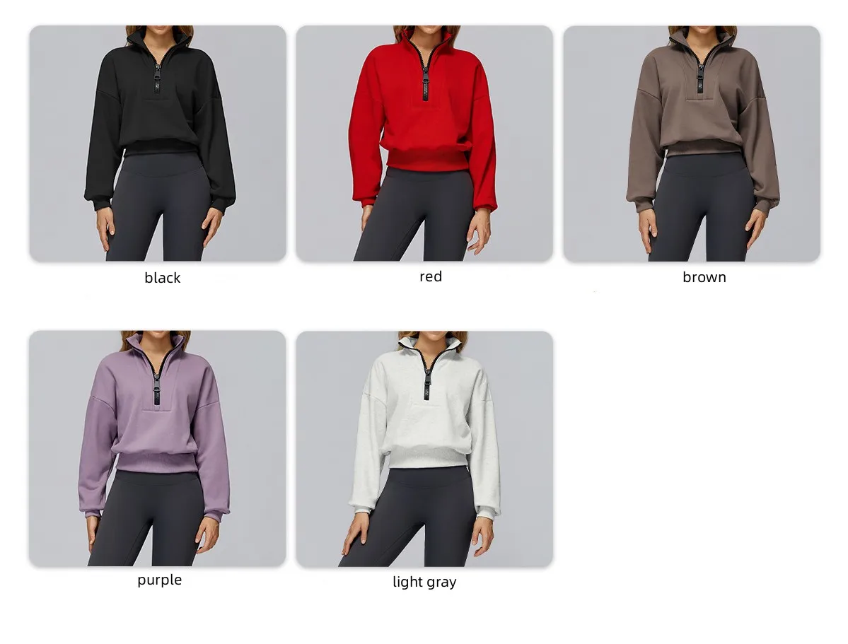 The half-zip front allows adjustable ventilation, while the soft, warm fabric helps retain heat during running, cycling, training, or casual outdoor activities. With its clean sporty look and flattering drape, this winter sweatshirt blends function and fashion for everyday active wear.